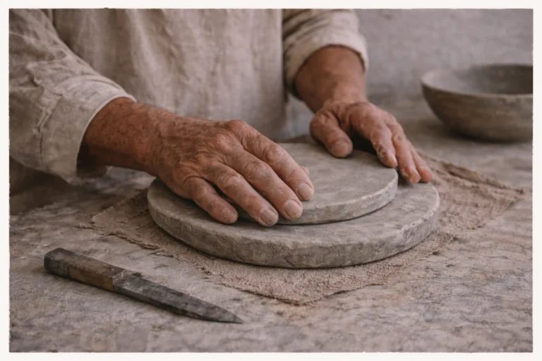 Paar stoneware is shaped slowly on a low wheel and finished by hand, not mass-produced. Clay is aged and wedged until it responds predictably; each disc is formed with measured pressure, allowed to settle, then carved and trimmed using simple…