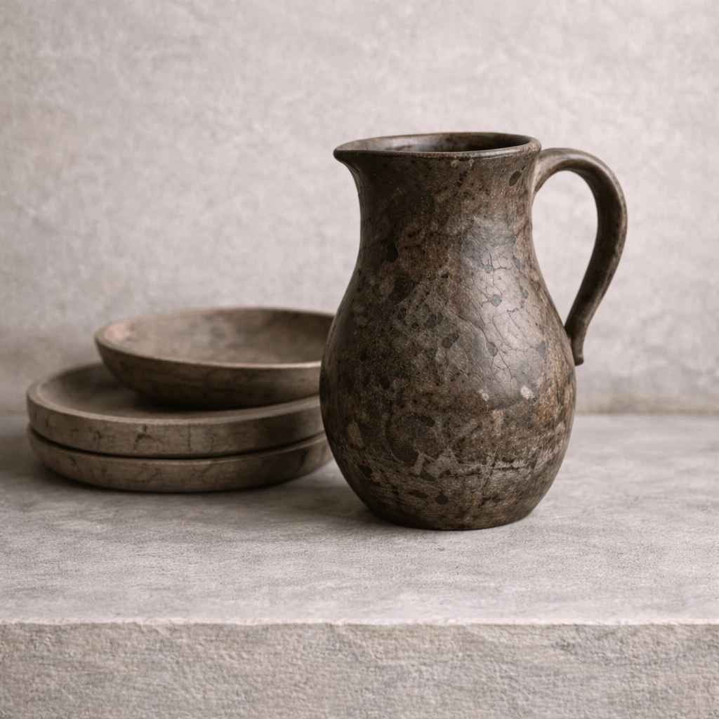 The Paar pitcher is hand-shaped with a gentle curve and a weighted handle for everyday use. Its stone surface carries natural variations that make each piece distinct. Designed for water or serving, it brings a quiet, grounded presence to the table.